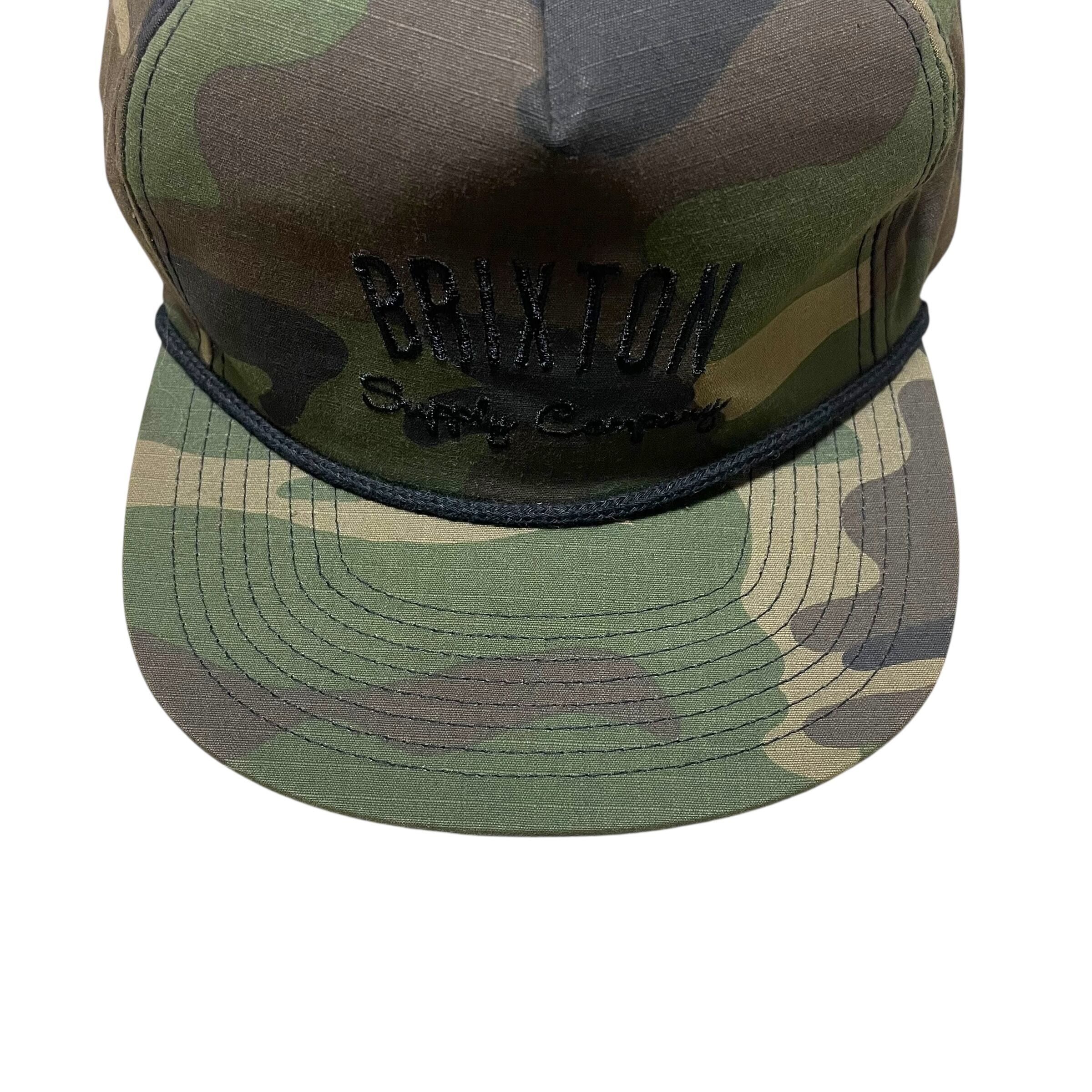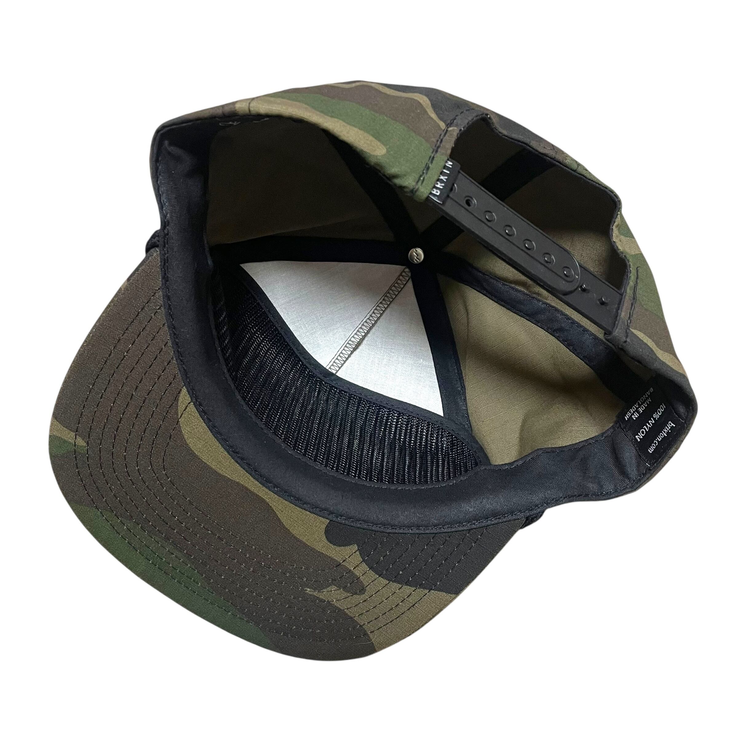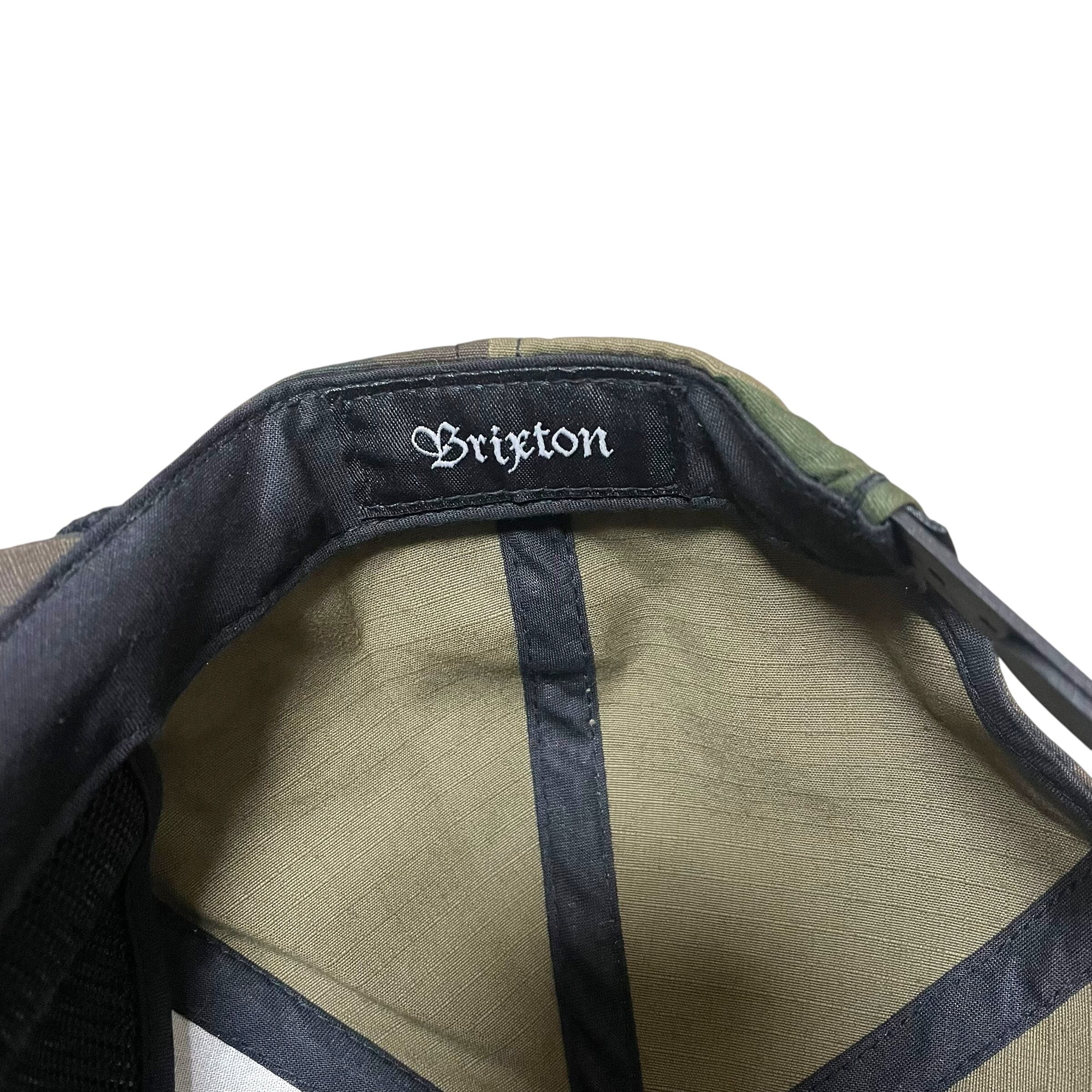 迷彩のボディにBRIXTONのネームデザインが刺繍されています。